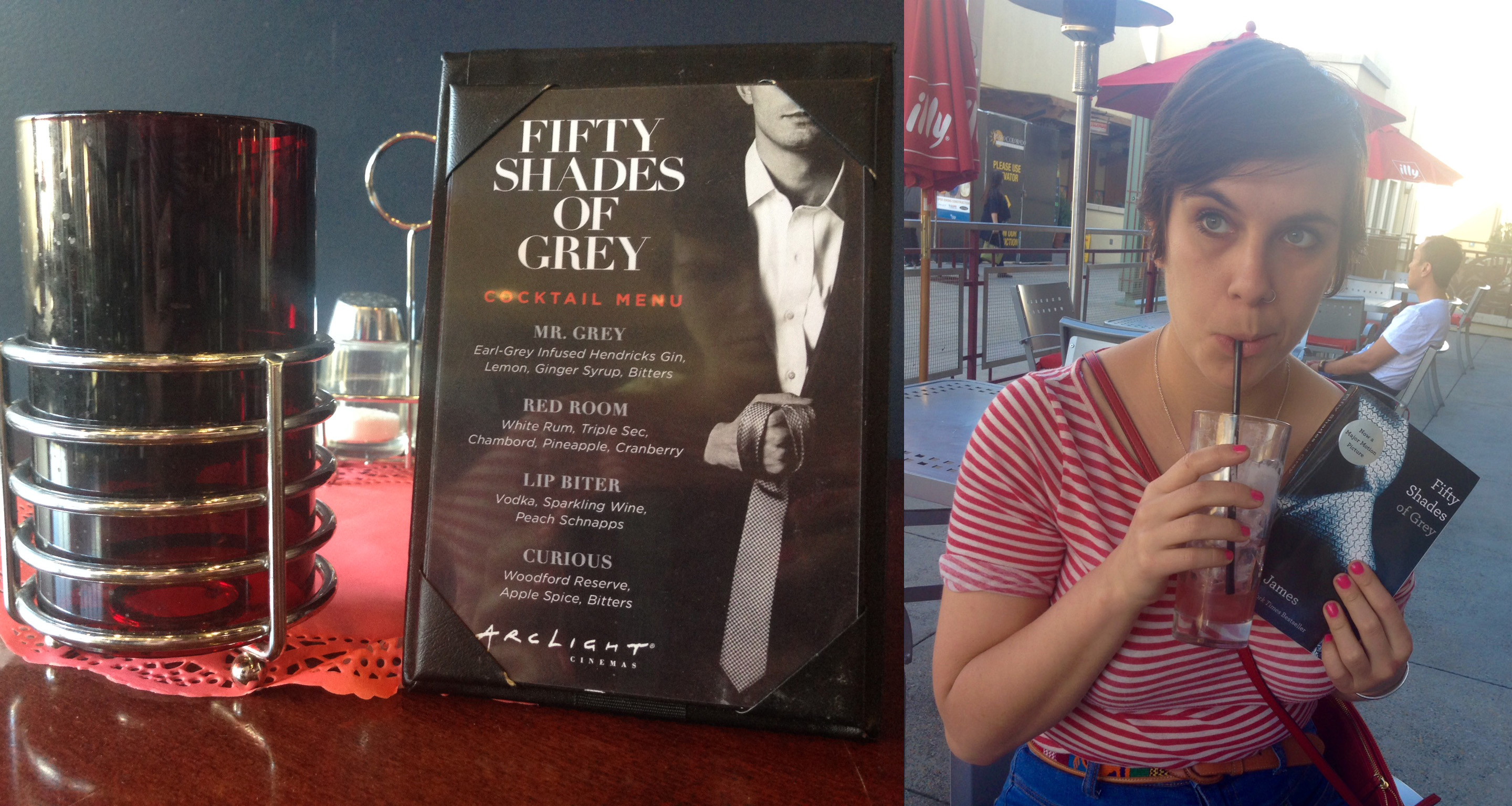 Luckily, the Arclight was offering a plethora of 50SoG themed drinks. I ordered the one that sounded the most disgusting: The Red Room- white rum, triple sec, chambord, pineapple and cranberry juice.
