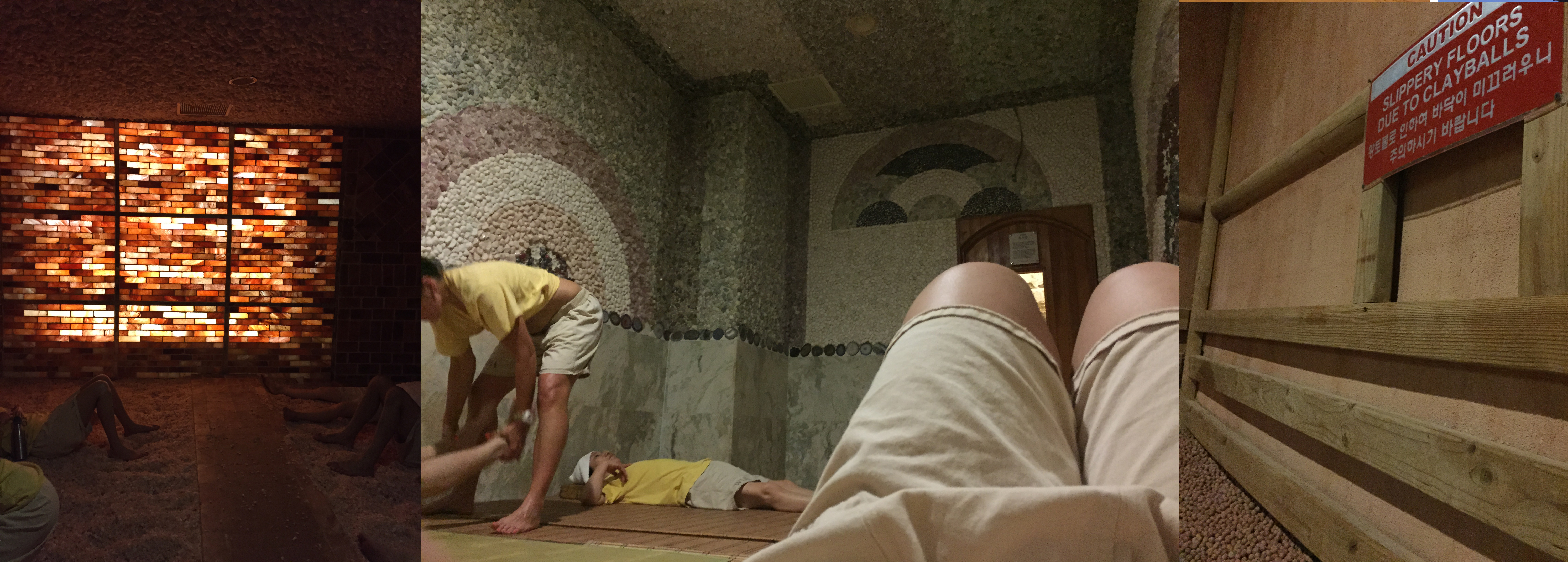 Left to Right: Salt Sauna (filled with savory people), Jade Sauna (filled with the scent of green tea and this strange couple stretching each other), Clay Sauna (filled with the noise of people comically slipping on marbles of clay trying to escape)