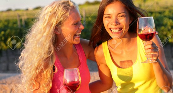 “Happy women friends drinking red wine laughing in vineyard in summer. Young laughing girlfriends drinking rose wine from glass outside” is the actually caption this photo CAME with.