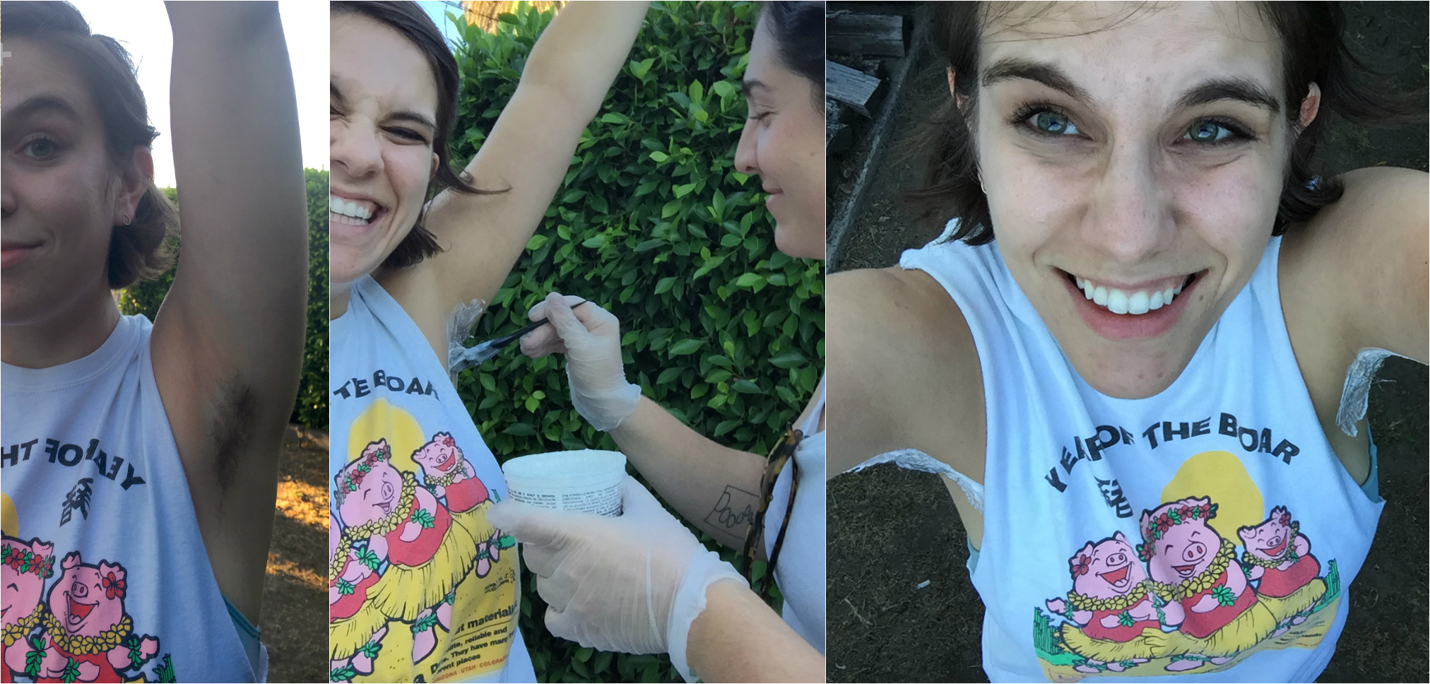 The popular aforementioned Roxie Hunt DIY blog served as my bible as we got to pitting. We threw on some gloves to protect our selves from catching bra-burnings, and lubed up my pits with bleach.