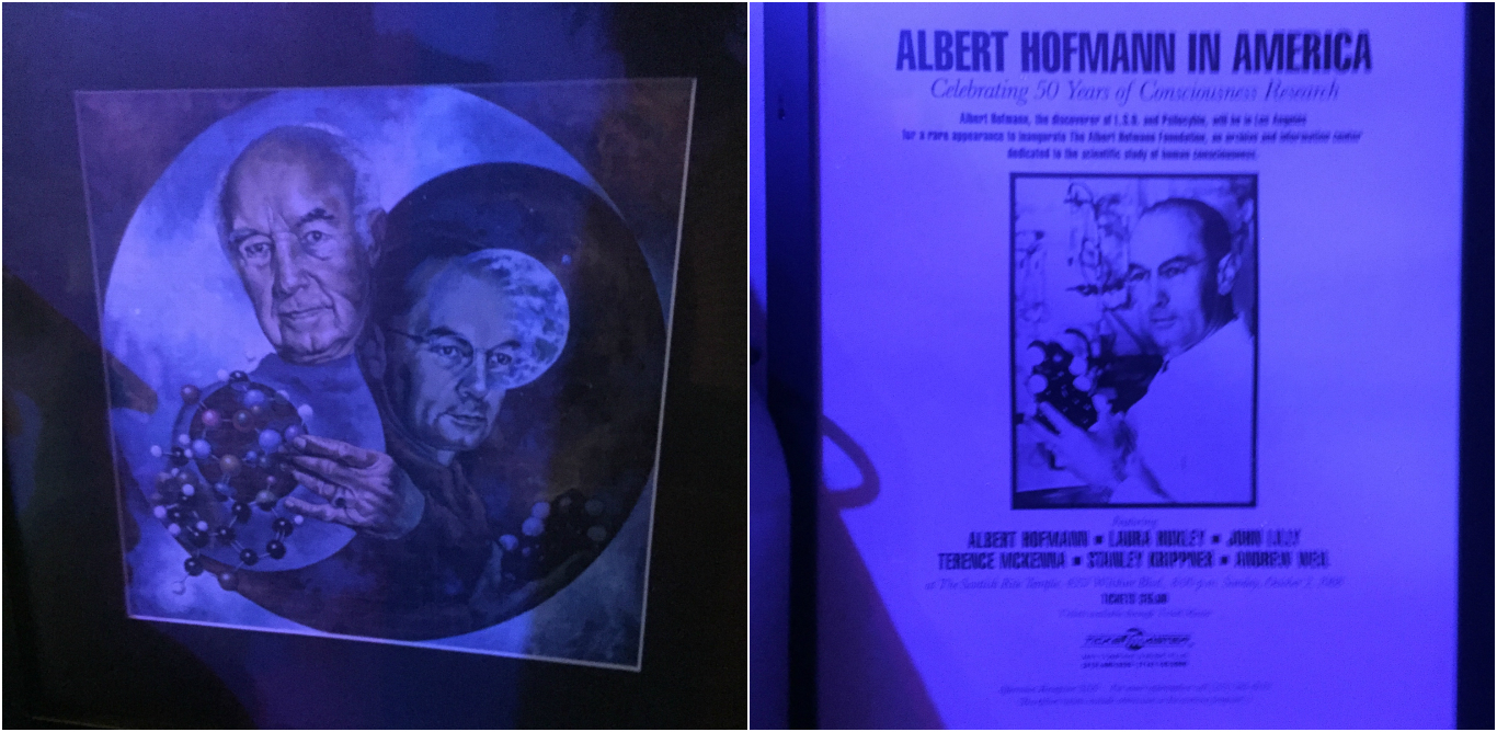 How had I not noticed this before? On every wall, a mans face. Presumably the man who popularized this treatment was being immortalized in this dark drug den, illuminated by blacklights like Jim Morrison.