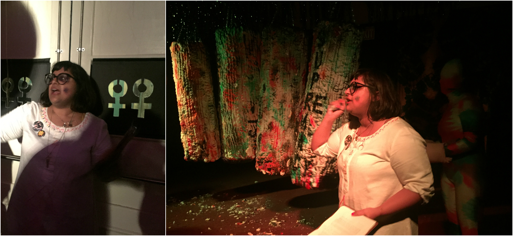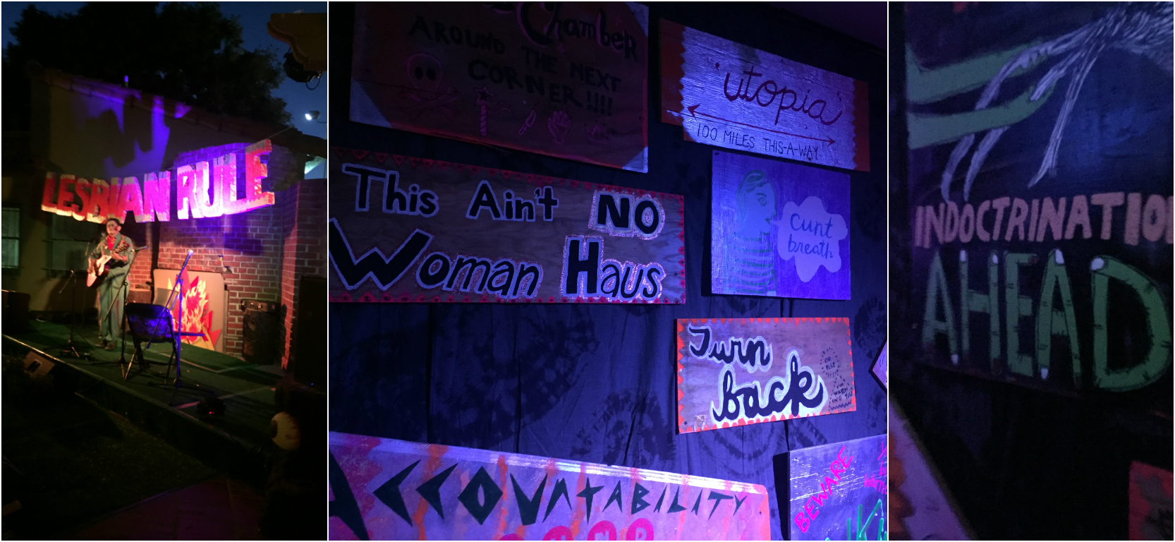 We were warned of the horrors that lay within the uterine walls of Killjoy’s Kastle (and told photos were fine so get off my back world- this is my escape from you) and led us into the lobby of the Kastle, where a zombie woman in a work onesies sang folk songs in front of a sign that read “Lesbian Rule.”